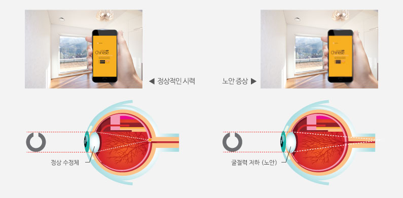 노안이란 나이가 들면서 가까이에 있는 물체에 초점을 맞추는 능력이 떨어져 근거리 시력이 떨어지는 현상입니다. 질병이라기 보다는 수정체의 노화에 따른 눈의 장애 현상으로, 보통 40대가 넘어가면 수정체의 탄력이 떨어지고 두꺼워지며, 두께를 조절하는 모양체 근육의 힘도 떨어지게 됩니다. 때문에 수정체의 조절기능이 약해져 가까운 거리의 사물이 선명하게 보이지 않는 것입니다.